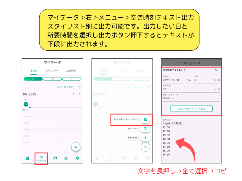予約の空き時刻をテキスト出力できるようになりました。SNS投稿やお客様との予約やりとり時にご活用ください。