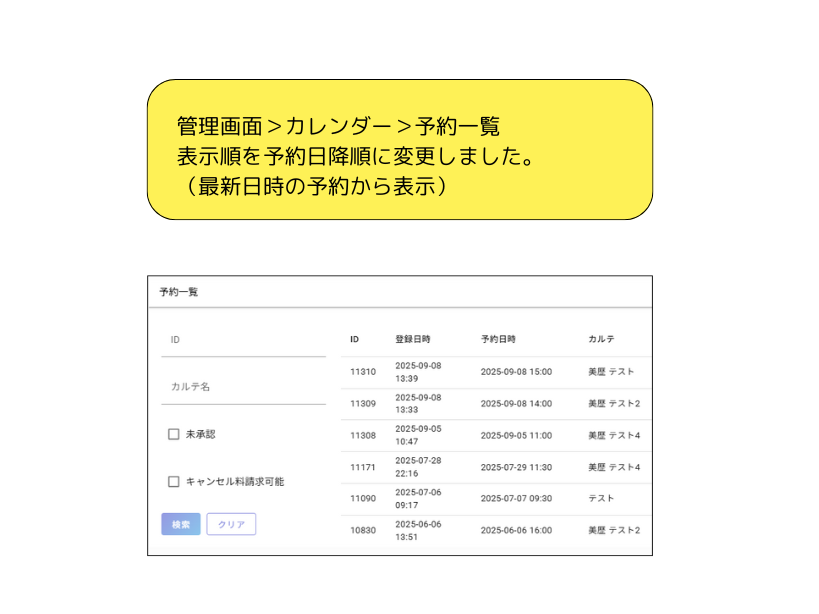予約一覧で表示される順番を予約日時降順になり、より分かりやすくなりました。