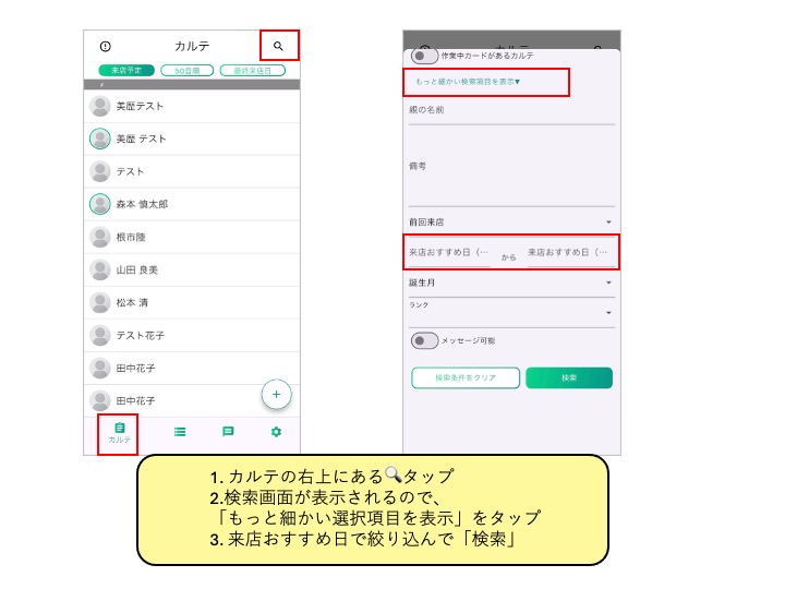 カルテ右上の🔍マーク>もっと細かい選択項目を表示>来店おすすめ日入力>検索