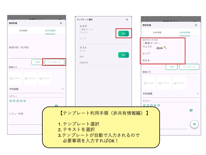 施術内容入力欄の下のテンプレートボタンをタップするとテンプレート文字が表示されます。