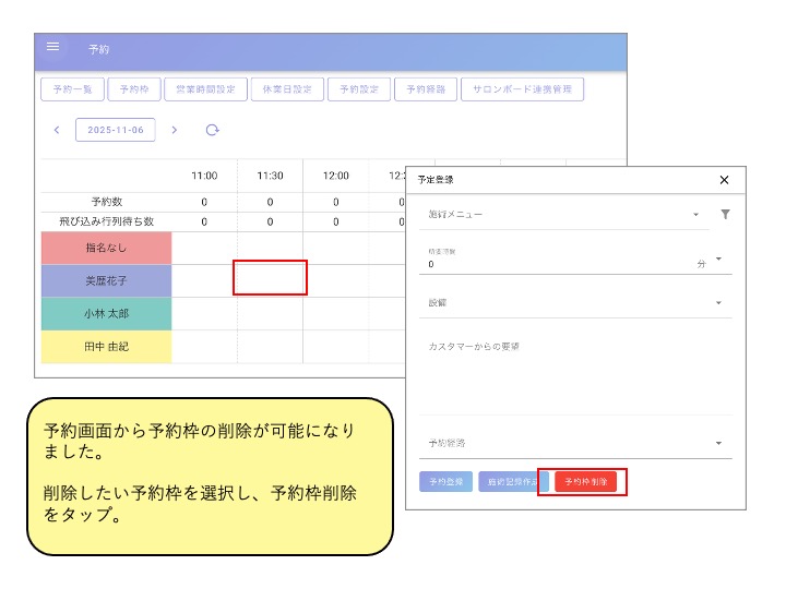 急遽予約枠の変更をしたい際など、これまではカレンダーの予約枠設定から操作が必要でしたが、今回のアップデートにより、カレンダー上で直接予約枠の削除が可能となりました。