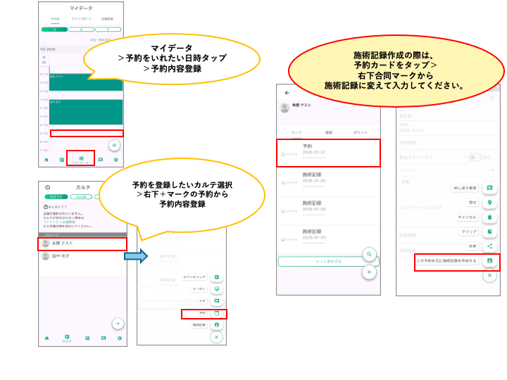 施術記録作成の際は、「予約カード」をタップし「この予約を元に施術記録を作成する」から作成いただけます。